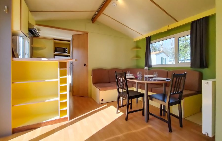 - Standard mobile homes (type D) with 2 sleeping rooms (1 double bed & 2 single beds) : 119€ per night / mobile home